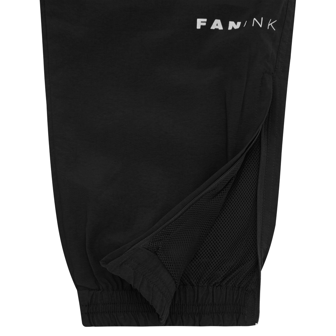 Elasticized waistband. 2 waist pockets with contrast piping. Fan Ink screen printed at left leg. Elasticized cuffs with invisible zipper detail. Made in Portugal.